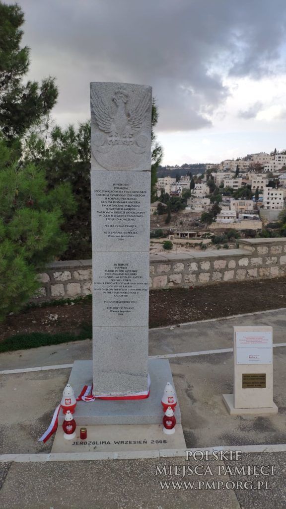 „ W hołdzie Polakom spoczywającym na tym cmentarzu, osobom cywilnym i żołnierzom II Korpusu Polskiego gen. Władysława Andersa, byłym jeńcom i więźniom sowieckich łagrów, zmarłym w drodze do Ojczyzny w latach II wojny światowej i po jej zakończeniu. Polska o Was pamięta, Rzeczpospolita Polska, Warszawa-Jerozolima 2006”