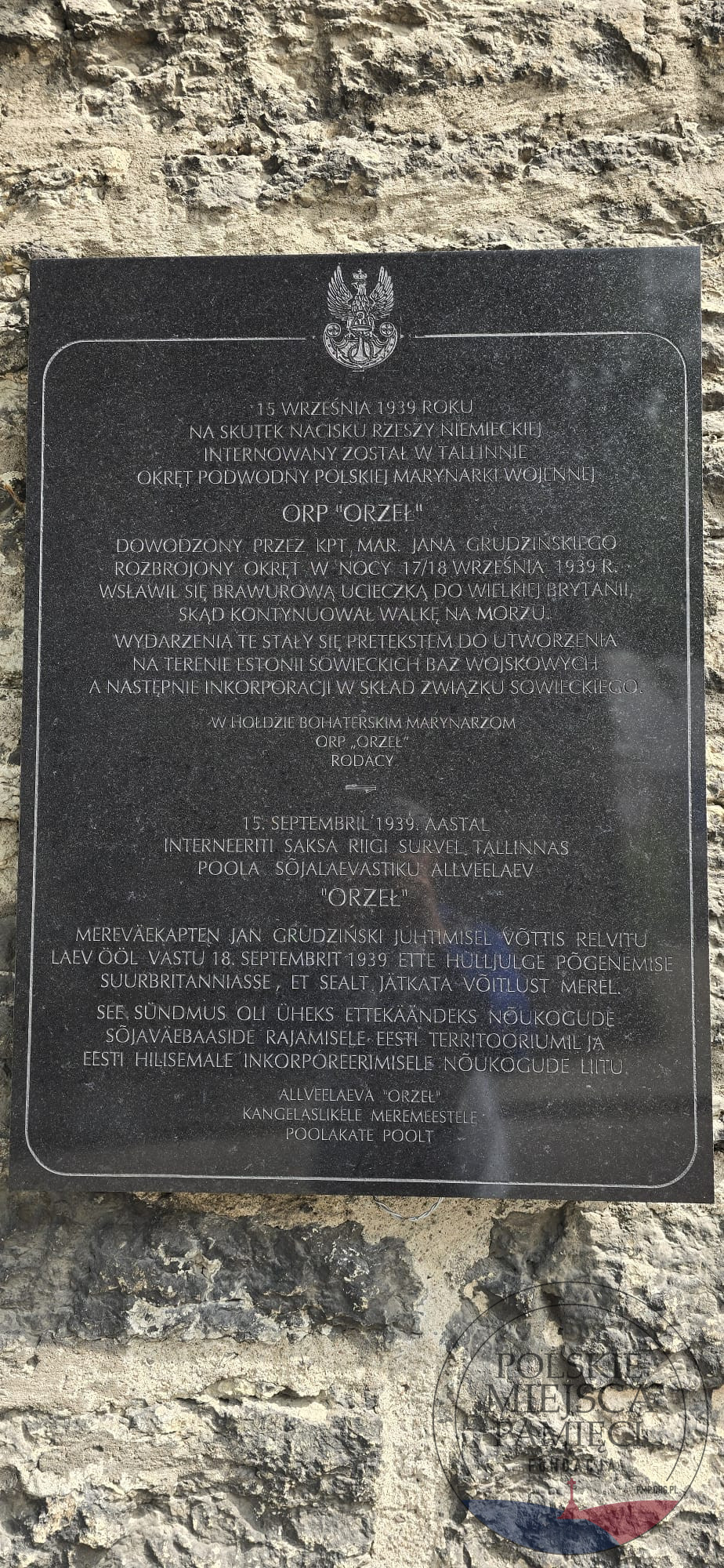 W Tallinnie, przy ulicy Pikk tn 70, tuż obok wejścia do Estońskiego Muzeum Morskiego, znajduje się pamiątkowa tablica poświęcona ORP „Orzeł”; polskiemu okrętowi podwodnemu, który we wrześniu 1939 roku został internowany w estońskim porcie na skutek niemieckich nacisków. Tablica, umieszczona w dwóch językach: polskim i estońskim; upamiętnia brawurową ucieczkę załogi w nocy z 17 na 18 września, gdy rozbrojony okręt wydostał się z Tallinna i przedarł do Wielkiej Brytanii, by kontynuować walkę przeciwko III Rzeszy. Wydarzenia te miały dalekosiężne konsekwencje, stając się pretekstem dla ZSRR do żądań utworzenia baz wojskowych w Estonii, co ostatecznie doprowadziło do aneksji kraju przez Związek Radziecki w 1940 roku.